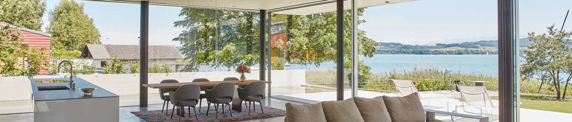 [مكان للصورة] نافذة بانورامية منزلقة لغرفة معيشة حديثة.